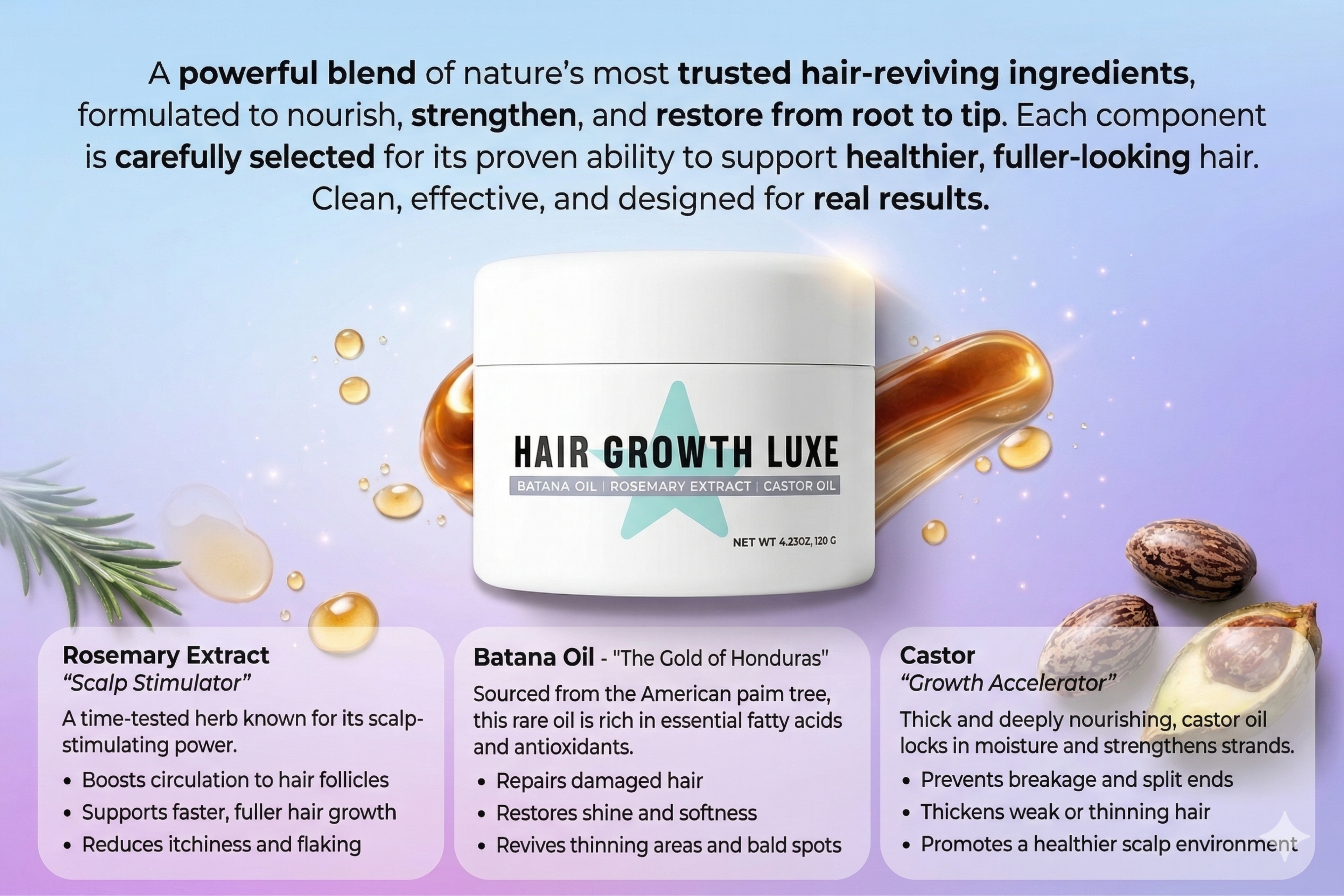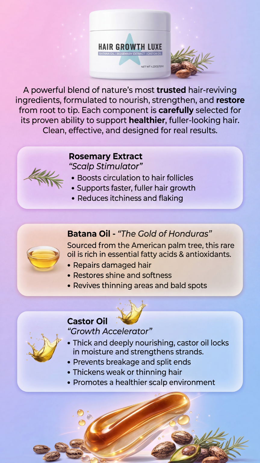 Hair Growth Luxe is a premium butter oil formulated with Batana Oil, Rosemary Extract, and Castor Oil to promote longer, stronger, and healthier hair. It’s clean, non-toxic, cruelty-free, and safe for both women and men.